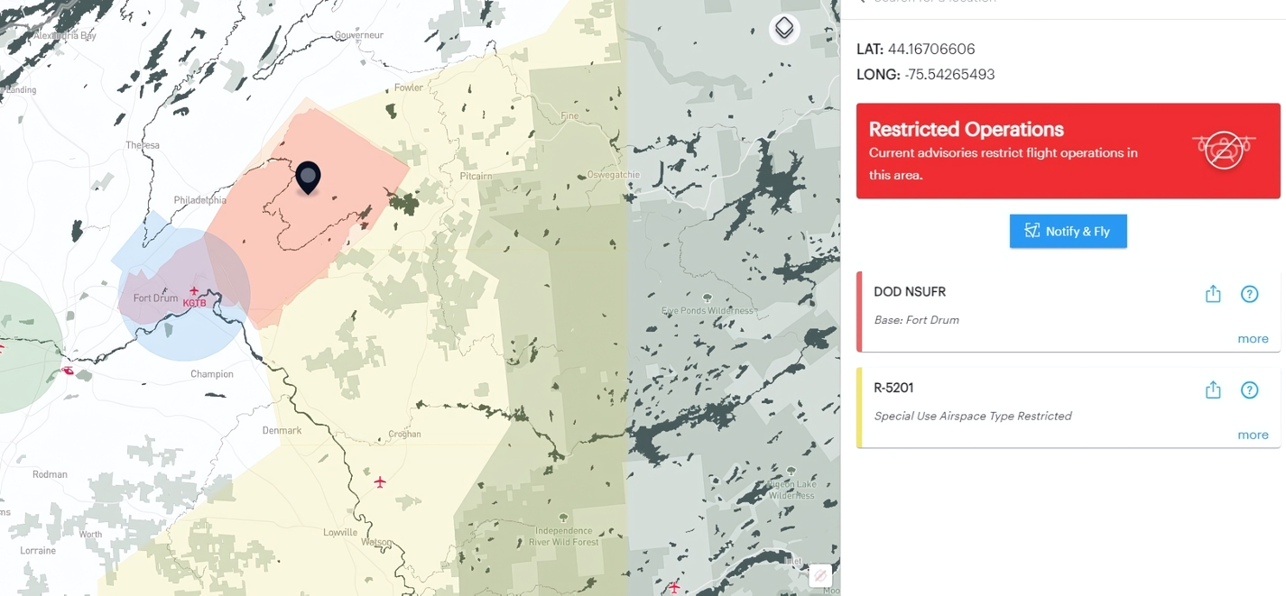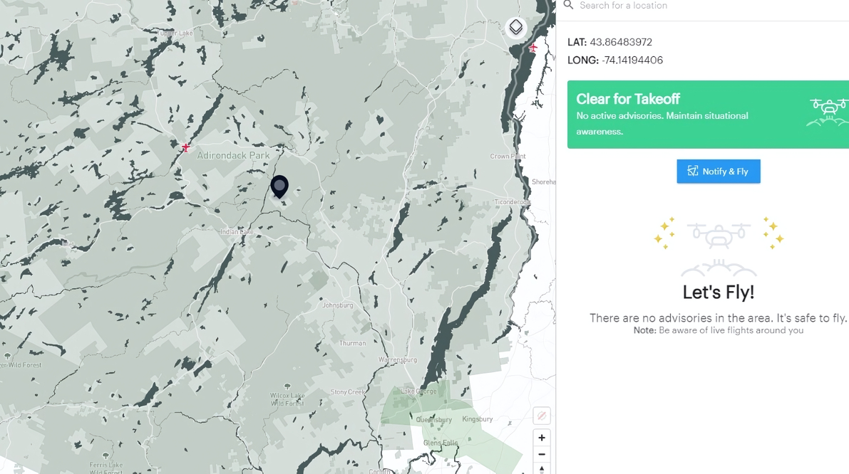 В обязательном порядке используйте интерактивную карту. Укажите место, где вы планируете использовать дрон, и на сайте появится актуальная информация. Допустим, вы хотите поснимать красивые природные места, расположенные на территории нью-йоркского парка «Адирондак». Указываете точку на карте и проверяете: